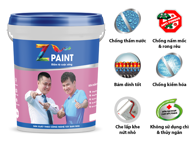 Sơn chống thấm màu Z-Paint là sơn chống thấm gốc nước được sản xuất dựa trên công nghệ tiên tiến với thành phần nhựa Acrylic copolymer, sử dụng công nghệ Hydro block Power có tác dụng ngăn chặn thấm nước tối ưu cho bề mặt tường đứng ngoại thất. Bên cạnh đó, nhờ độ đàn hồi cao mà màng sơn có thể che lấp các vết nứt tĩnh nhỏ trên bề mặt. Sơn chống thấm màu Z-Paint được sử dụng trực tiếp ngay sau khi mở nắp mà không cần pha trộn với xi măng. Cùng với thời gian khô được rút ngắn so với các loại sơn chống thấm thông thường nên có thể tiết kiệm tối đa thời gian và chi phí thi công. Sản phẩm không chứa chì, thuỷ ngân và phooc-môn rất an toàn cho sức khoẻ của người thi công và người sử dụng.
